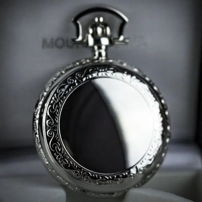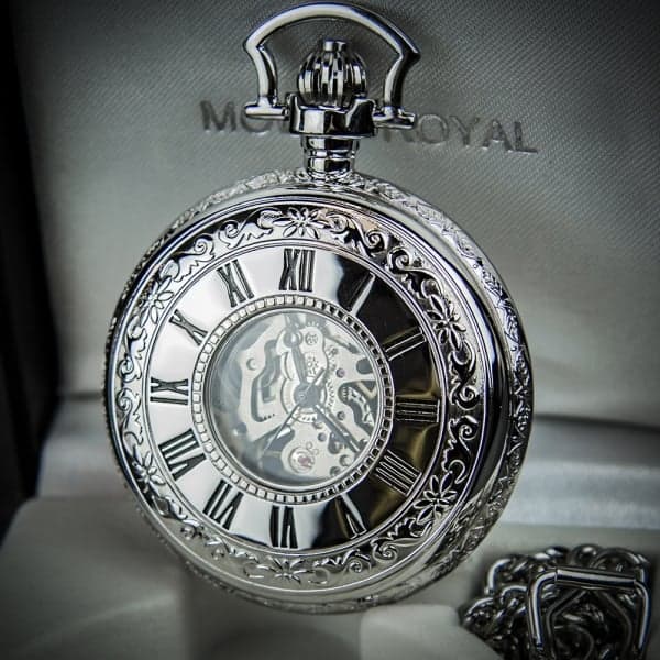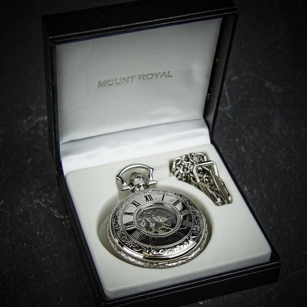Front and back openings, patterned case, white Roman dial and a skeleton heart. Quick checks up front; mechanics in the back. Mechanical wind-up. ?4.6 cm ? 1.3 cm. Chain + box included.