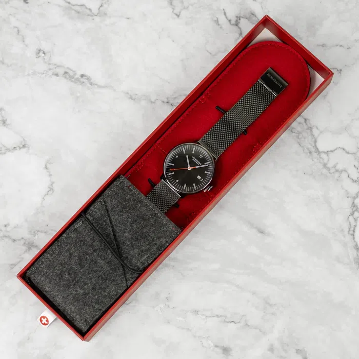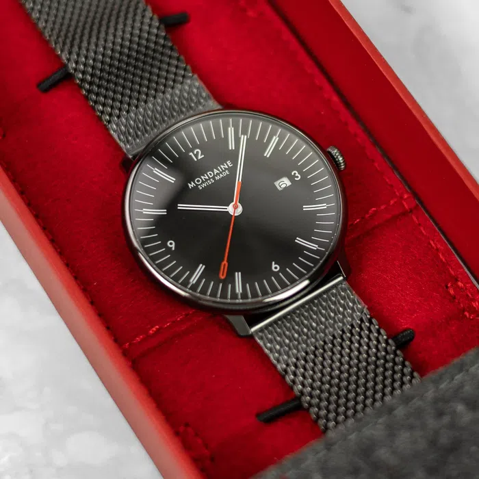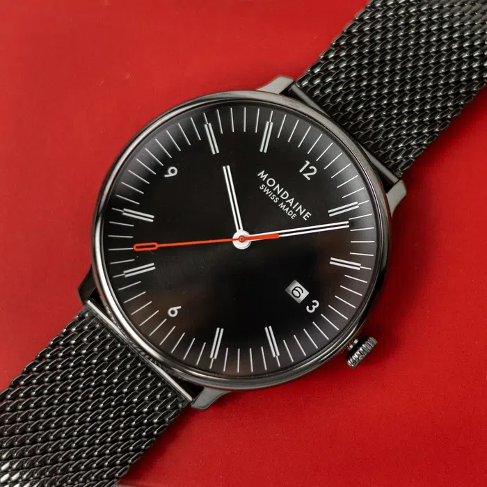 Vintage cues, modern discipline. A concave, brushed dial under double-domed sapphire; twin lines echo the design's duality. 41 x 8.5 mm, 20 mm lugs, mesh bracelet, date, 5 ATM.