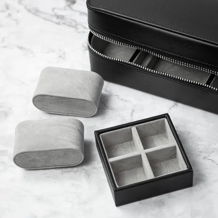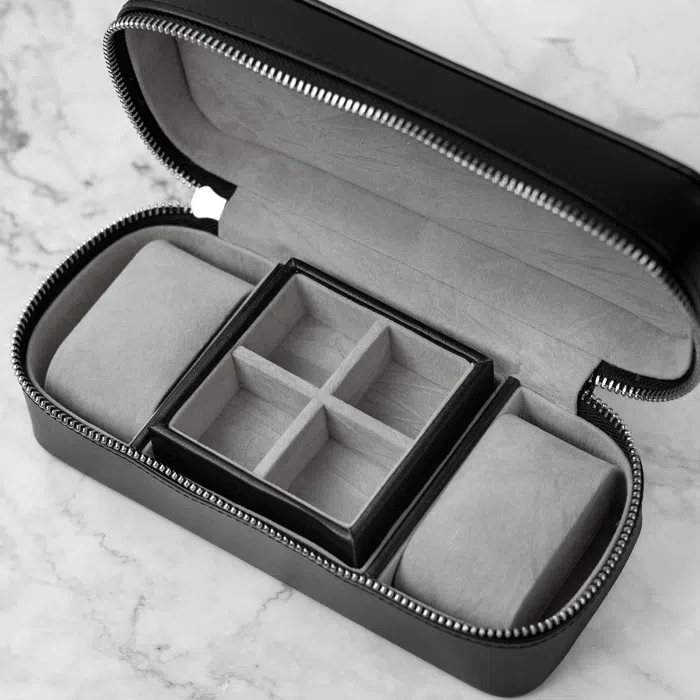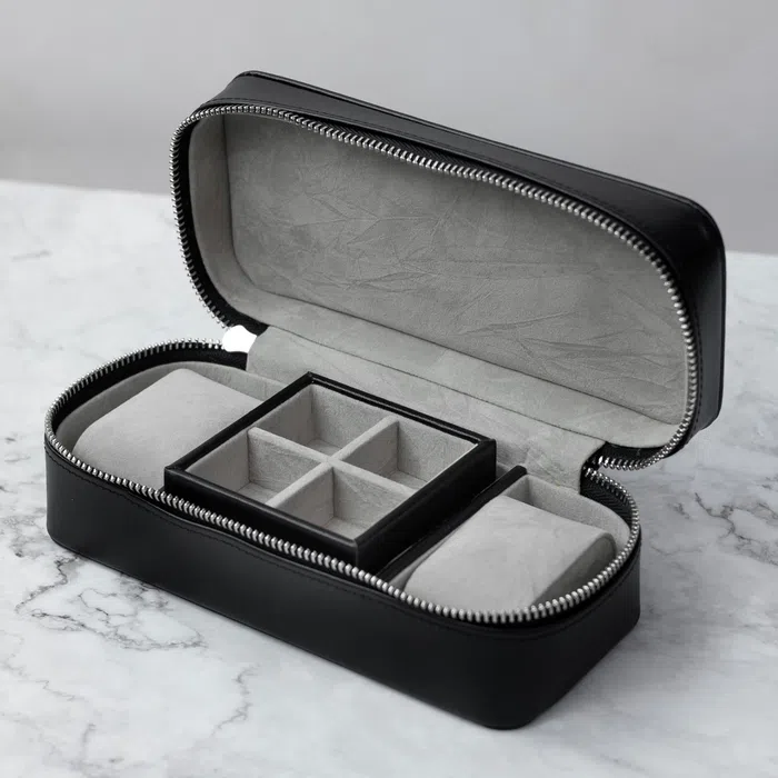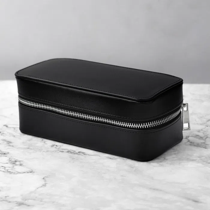 Travel sharp, land sharper. Distressed outer, plush velvet interior and a secure zip keep a hero watch and cufflinks scratch-free. Business trip, wedding, big pitch - ready.