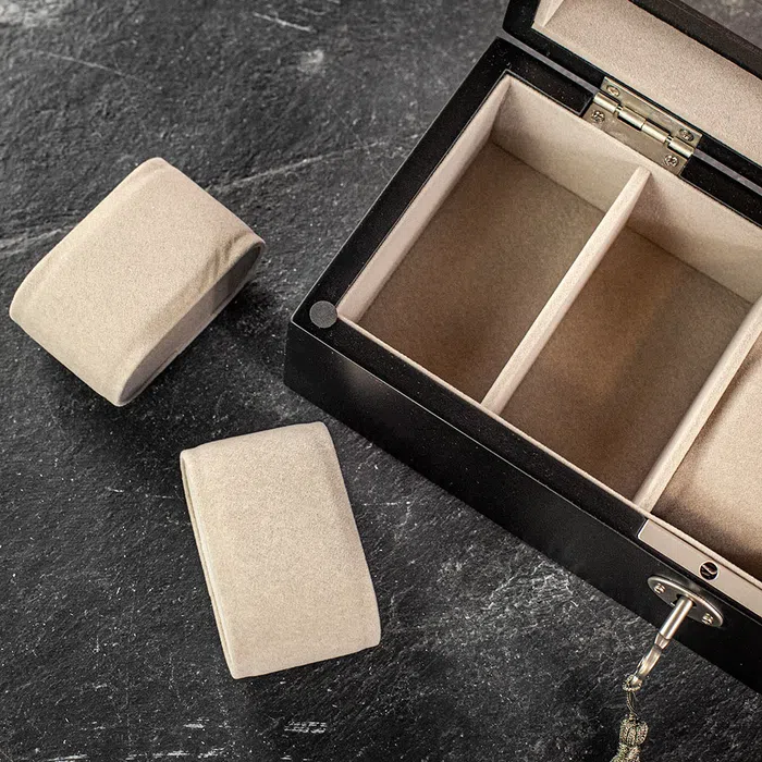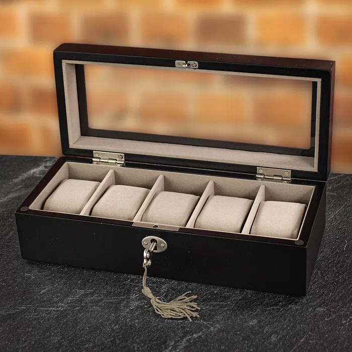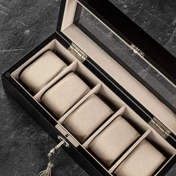 Stop storing watches in socks. Five soft cushions under a clear lid with clean hardware. Compact footprint; maximum smug.